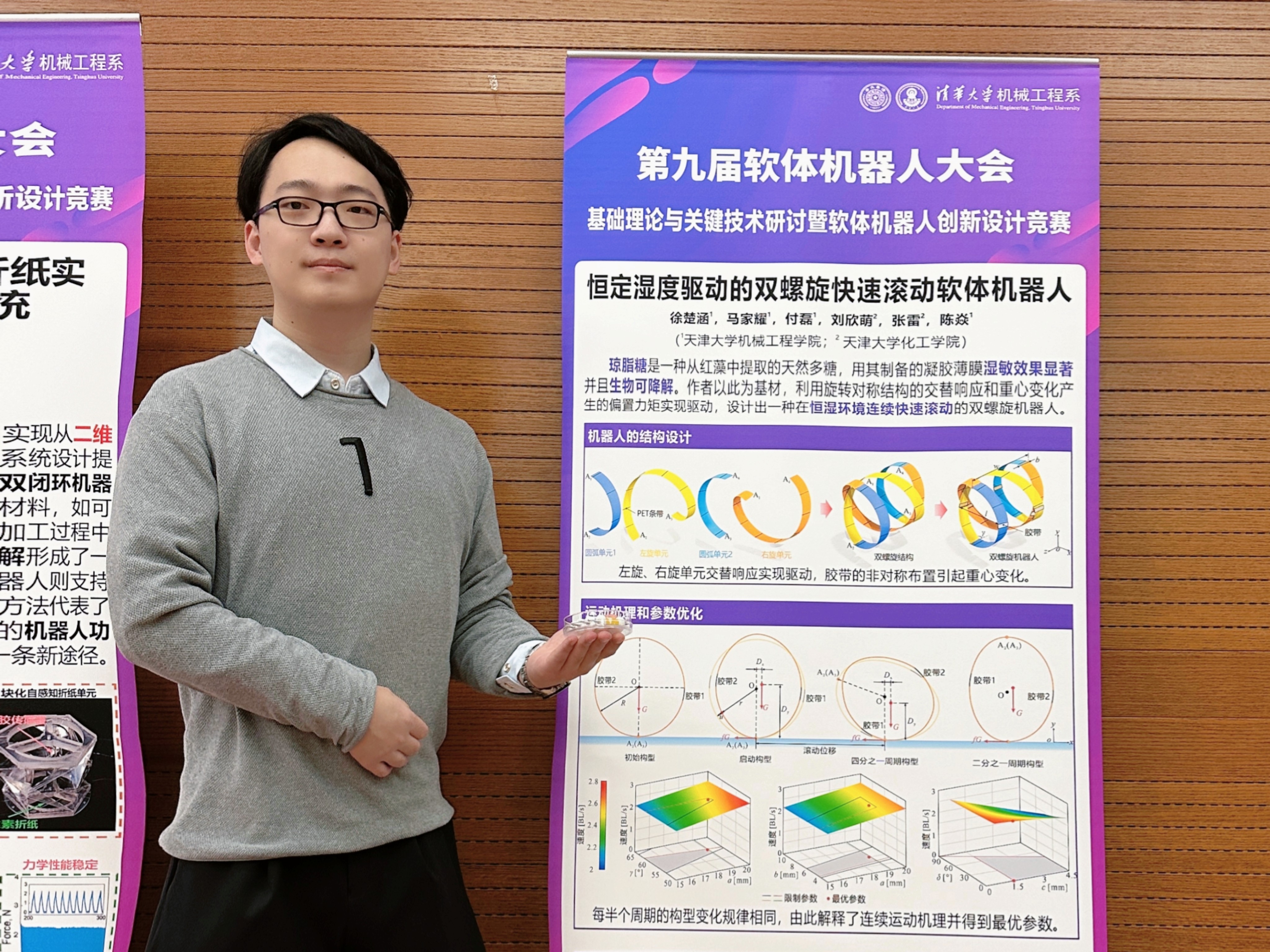 徐楚涵同学为2023级硕士生,研究方向为基于智能材料的软体机器人结构设计与运动分析。目前以第一作者身份在1区top期刊Advanced Science发表论文一篇,以其他作者身份参与发表论文4篇。参加第二十四届中国机构与机器科学及应用会议、第九届软体机器人大会等学术会议,作品曾获海报展示二等奖、绿色环保创意奖。