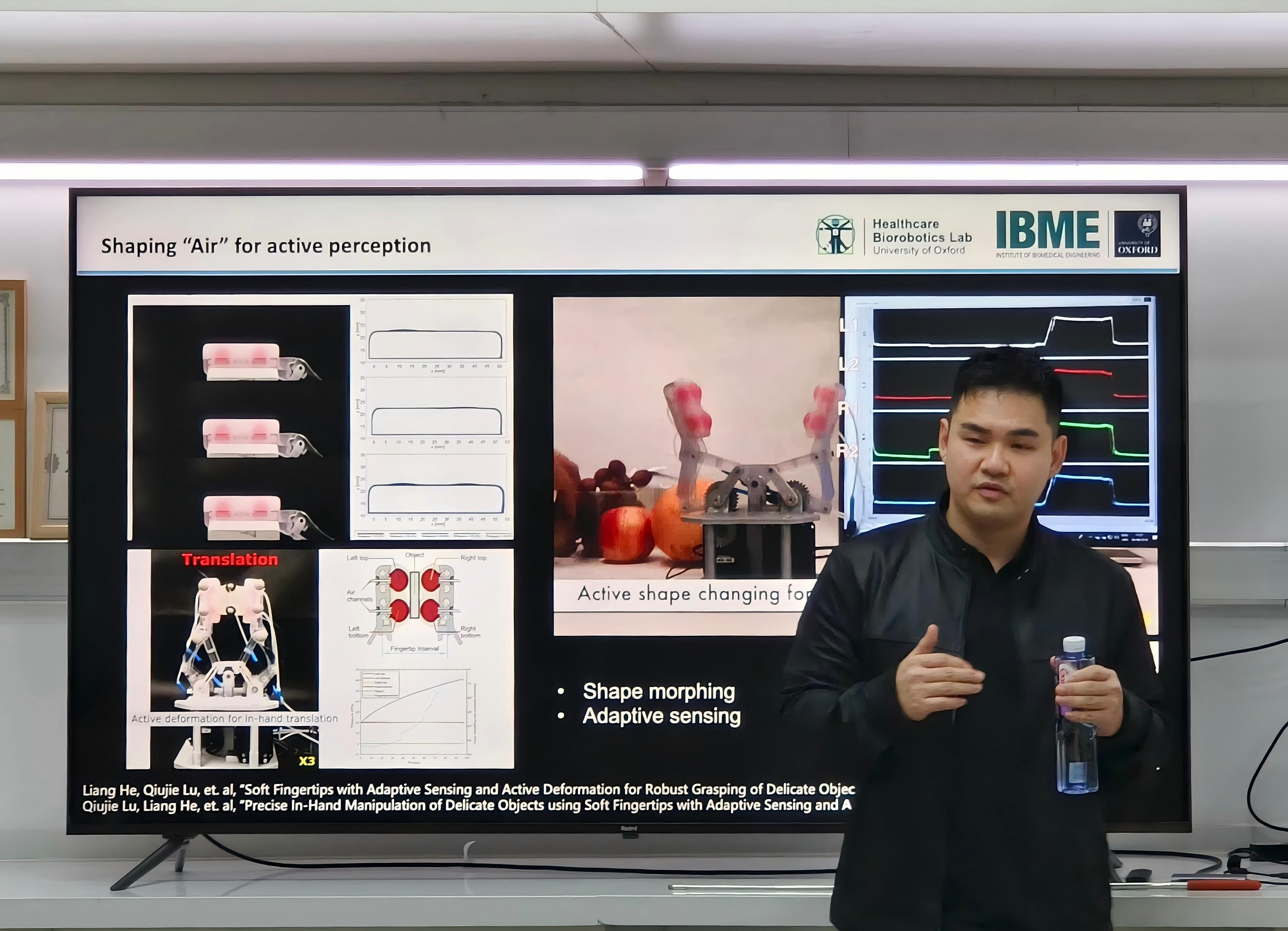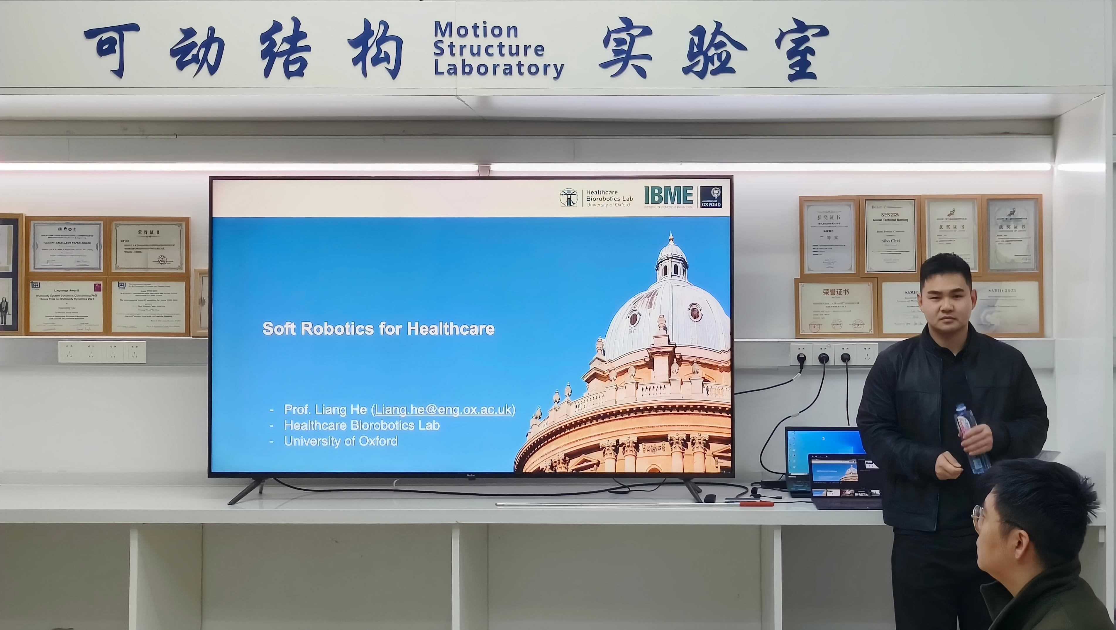 From: Date: 2025-10-31 2025年10月30日,应陈焱教授邀请,来自牛津大学的赫亮老师访问了天津大学可动结构实验室。 赫亮老师为大家带来了题为“Soft Robotics for Healthcare”的精彩报告。报告指出,尽管计算能力的飞速提升使人工智能体能够理解和响应人类指令,但人与人工智能体之间的物理交互水平仍十分有限。这种深度物理交互被认为是构建真正理解人类并能提供生活辅助的人工智能的关键。一种弥合这一差距的方案是利用软体与可穿戴机器人作为人机世界的交互媒介,借助其生物相容性和仿生特性实现物理层面的沟通。本次报告介绍了牛津医疗生物机器人实验室(Healthcare Biorobotics Lab)的相关研究工作,为我们展示了机器人重建、气泡动态感知、可拉伸柔性传感器、柔性连续体致动器、康复训练软体机器人等研究成果。 赫亮老师是牛津大学工程科学系副教授及Kellogg学院正式研究员。他于伦敦帝国理工学院获得软体机器人学博士学位,并在牛津大学机器人研究所具身智能项目组完成博士后研究。此后,他加入牛津大学生物医学工程研究所,创建了医疗生物机器人实验室(HBL)。其研究方向涵盖软体机器人、可穿戴与辅助机器人技术、触觉交互和虚拟现实。HBL实验室致力于探索具身人工智能解决方案,以预防损伤、辅助康复并提升患者护理质量。赫亮老师同时担任牛津大学与NGO Podium Analytics战略合作伙伴关系下的运动医学与技术研究所核心教员。 |