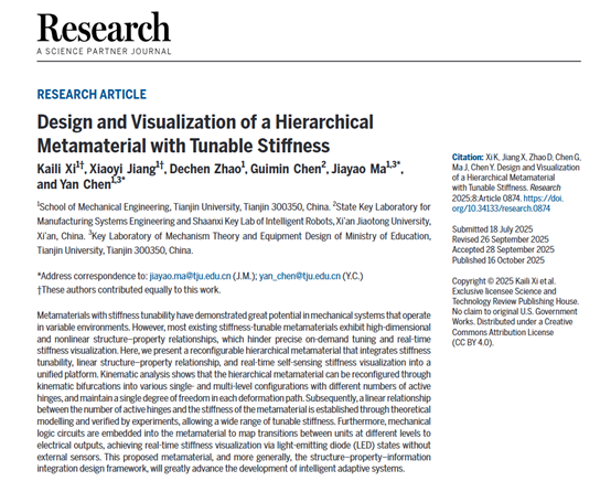 Kaili Xi#, Xiaoyi Jiang#, Dechen Zhao, Guimin Chen, Jiayao Ma*, Yan Chen*. Design and Visualization of a Hierarchical Metamaterial with Tunable Stiffness. Research. 2025, 8:0874.. |