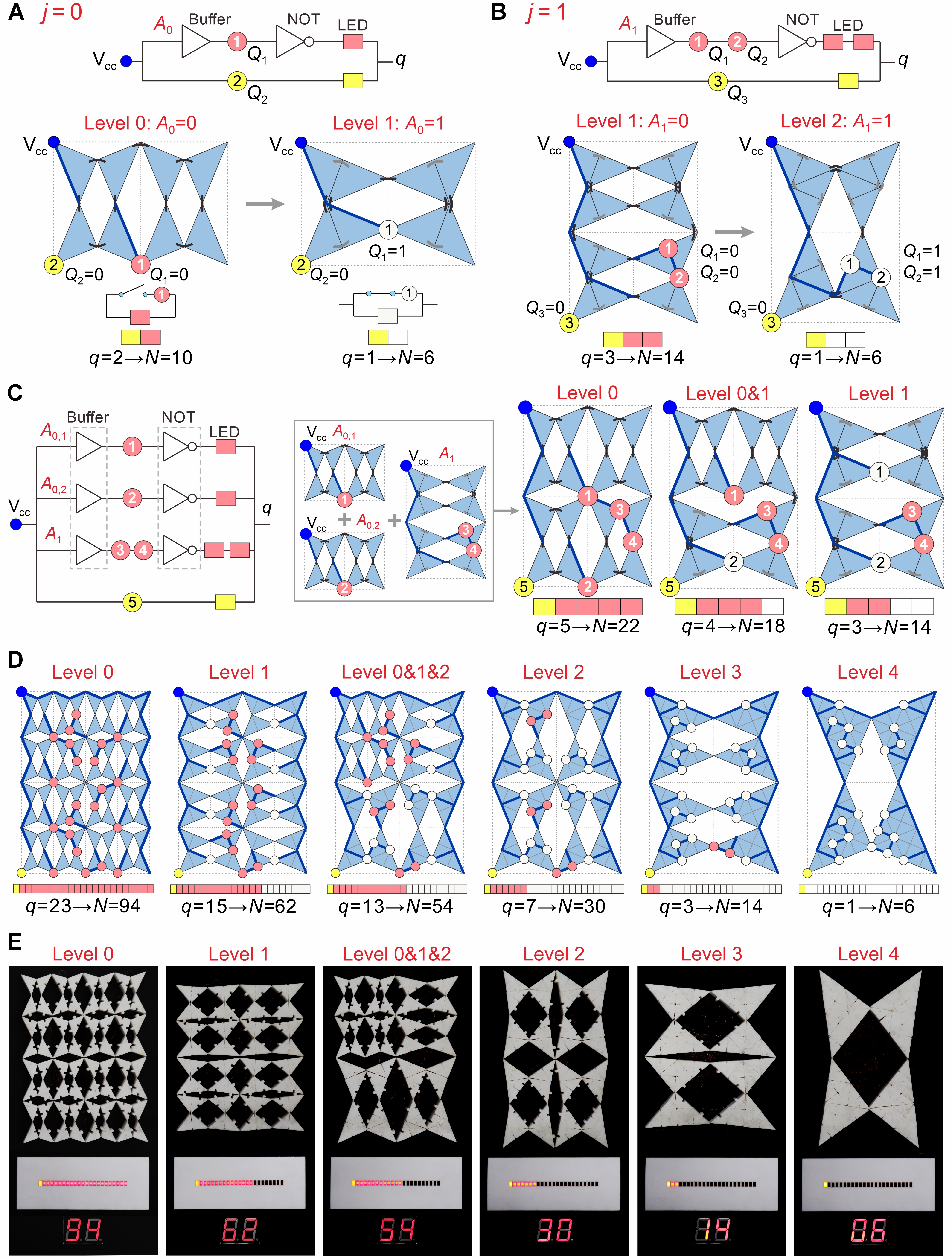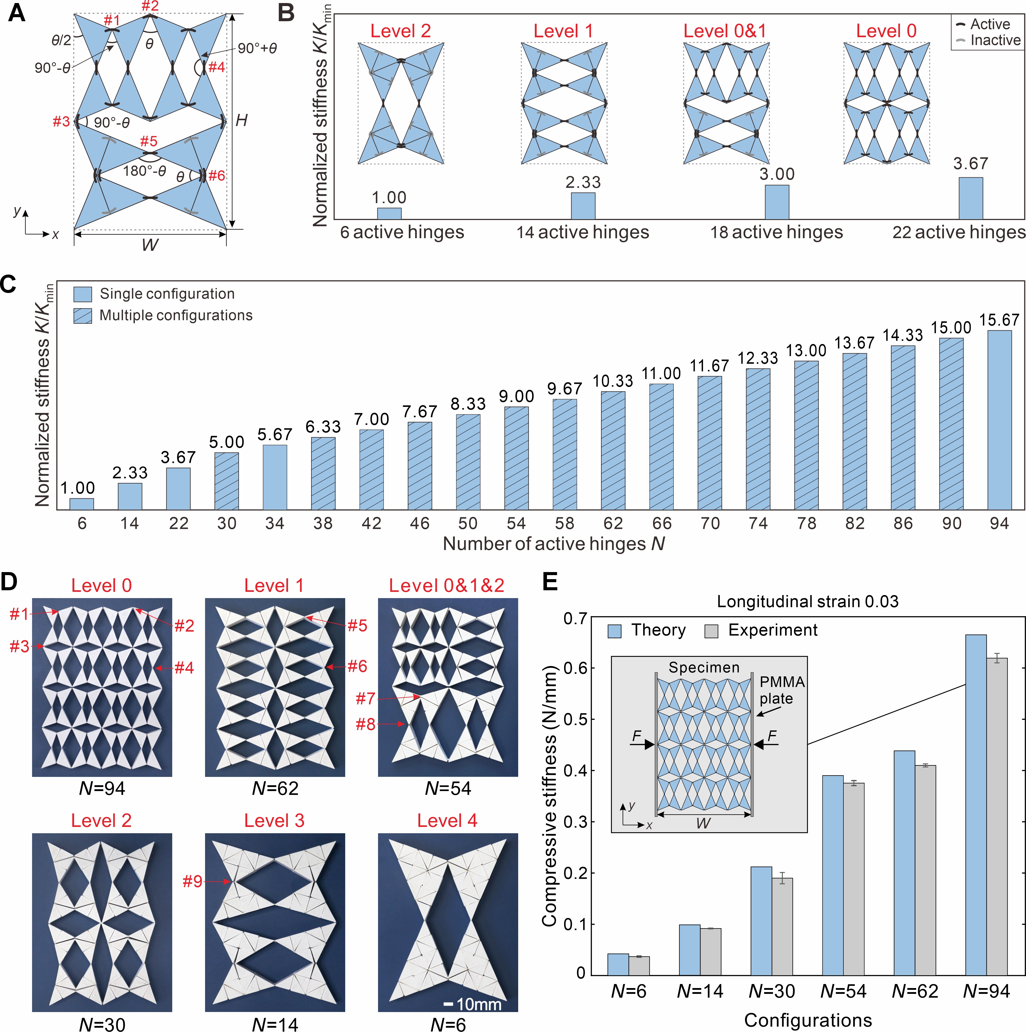 Movie S1 The reconfiguration process of a 4×4 metamaterial among 10 configurations The hierarchical reconfiguration, which leads to the variation of active hinges and single DOF motion behavior of the metamaterial, enables tunable stiffness over a wide range. Through theoretical modelling, researchers discover a linear relationship between the number of active hinges and the stiffness of the metamaterial when the rotational stiffness of each hinge is identical. For example, when the size of the metamaterial reaches 4×4, it includes 86 configurations with 20 different active hinge numbers of 6, 14, 22, 30, 34, 38, 42, 46, 50, 54, 58, 62, 66, 70, 74, 78, 82, 86, 90 and 94, leading to a wider tunability ratio of 15.67 (Fig. 3C). These experimental results confirm that the theoretical model accurately predicts the stiffness of metamaterials. Fig. 3. Tunable stiffness in hierarchical metamaterials Finally, to visualize the stiffness of the hierarchical metamaterial in real time, we integrate reconfigurable circuits in the metamaterial to map the transitions among units at different levels to the multichannel electrical outputs. This establishes a linear relationship between structure, properties, and information, enabling the metamaterial to display the number of active hinges and stiffness in various configurations without the need for external sensors. The experimental results (Fig. 4E and Movie S2) show that the number of active hinges as the 4×4 metamaterial reconfigures among 10 configurations (five single-level and five multi-level) can be accurately visualized by the lit LEDs and the 7-segment display, which demonstrate the reliability of the proposed design for real-time stiffness visualization in hierarchical metamaterials without external sensors. Fig. 4. Visualization of the number of active hinges in hierarchical metamaterials with tunable stiffness