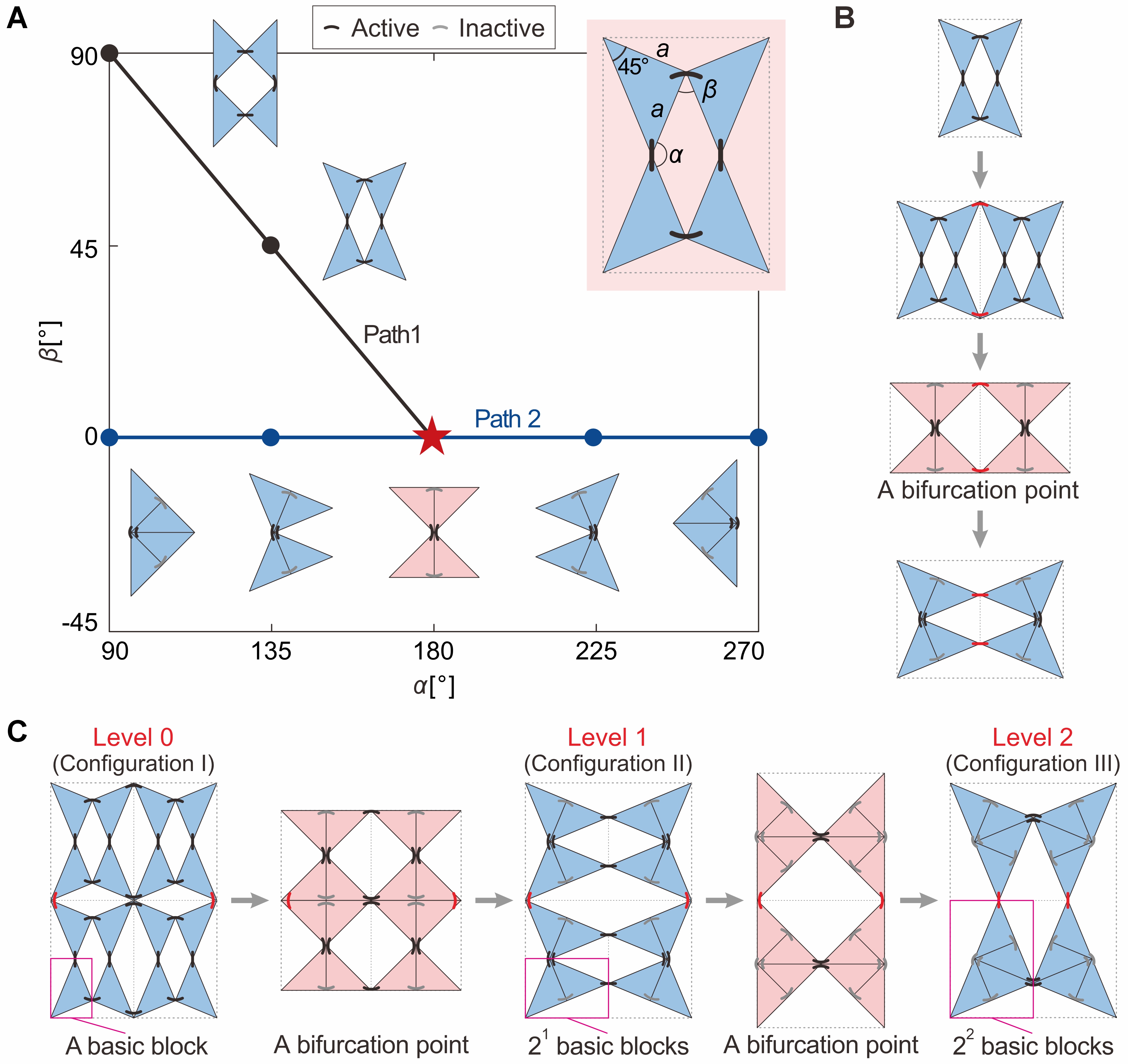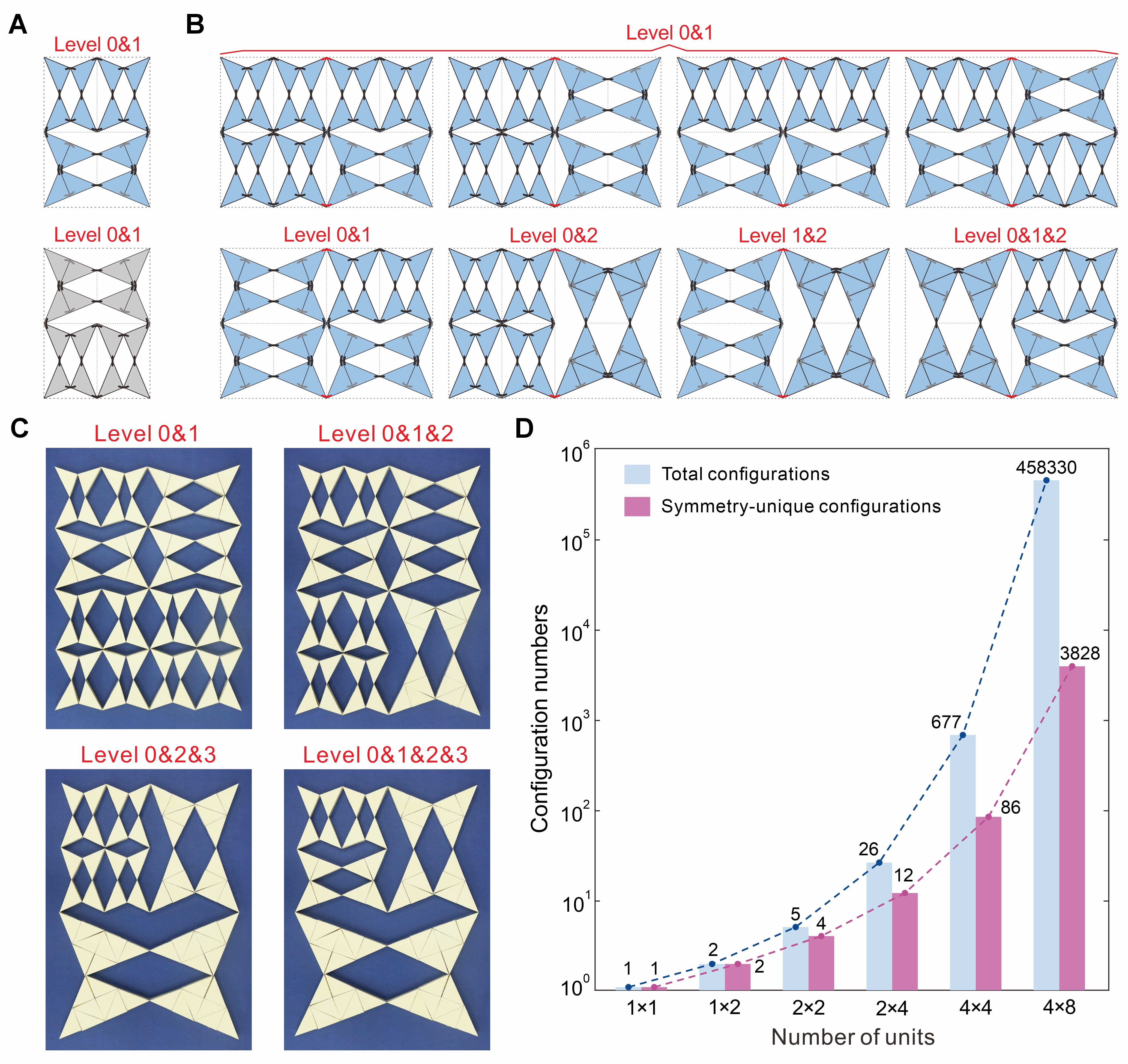 From: Date: 2025-10-21 Metamaterials with stiffness tunability have demonstrated great potential in mechanical systems that operate in variable environments. Real-time stiffness visualization, which translates the stiffness information into digital outputs, allows users to know the exact stiffness after tuning without the need for external sensors, and thus holds great application potential in human-robot interaction and adaptive robotic systems. However, most existing stiffness-tunable metamaterials exhibit high-dimensional and nonlinear structure-property relationships, which hinder precise on-demand tuning and real-time stiffness visualization. To this end, a research team of Professor Yan Chen from the School of Mechanical Engineering at Tianjin University proposed a reconfigurable hierarchical metamaterial. By establishing a linear relationship between the stiffness of the metamaterial and the number of active hinges, the team achieved a linearized structure-property relationship. Furthermore, mechanical logic circuits were embedded into the metamaterial to map different hierarchical configurations to LED-visualized stiffness values, realizing the integration of structure, property, and information. The research, titled “Design and Visualization of a Hierarchical Metamaterial with Tunable Stiffness," was published online in Research on October 16, 2025. The co-corresponding authors are Professors Yan Chen and Jiayao Ma, and the co-first authors are Ph.D. student Kaili Xi and M.S. student Xiaoyi Jiang. M.S. student Dechen Zhao provided experimental support, and Prof. Guimin Chen from Xi'an Jiaotong University provided guidance. The research was supported by the National Natural Science Foundation of China. 研究内容 The metamaterial unit, as shown in Fig. 1A, is composed of four isosceles right-angled triangular blocks connected by four hinges (black arcs), which form a planar four-bar linkage. Leveraging the kinematic bifurcation behavior of the unit, researchers tessellate these units in a plane to create a single degree of freedom (DOF) reconfigurable hierarchical metamaterial. The proposed metamaterial can switch between various configurations and maintain a single DOF throughout their motion paths except at bifurcation points. Researchers define the hierarchy of the metamaterial based on the size of triangular blocks in the four-bar linkages. For instance, a 2×2 metamaterial can reconfigure into single-level configurations with four level 0 units, two level 1 units, or one level 2 unit. During this process, the hinges enclosed in the larger blocks do not rotate and are thus considered inactive (grey arcs). Correspondingly, the number of active hinges varies during reconfiguration, as shown in Fig. 1C, where the number of active hinges at the three levels is respectively 22, 14, and 6. Fig. 1. Design of reconfigurable metamaterials and their hierarchical levels Beyond single-level configurations, the metamaterial can also be reconfigured to contain units of different levels, thus forming various multi-level configurations (Fig. 2). For example, a 2×2 metamaterial can form a multi-level configuration with two level 0 units and one level 1 unit (Fig. 2A). Since the grey configuration can be obtained by vertically mirroring the blue configuration, they are symmetry-equivalent and expected to yield identical stiffness. Therefore, researchers exclude configurations that are symmetry-equivalent by symmetry operations (second-order rotational symmetry, vertical mirroring, or horizontal mirroring), using a developed screening procedure. They retain only one representative configuration from each set of mutually symmetry-equivalent configurations, thereby identifying the symmetry-unique configurations. Further extending metamaterials to 2×4 and even 4×4 configurations significantly increases the number of multi-level configurations, encompassing hierarchical levels such as 0&1, 0&1&2, 0&2&3, and 0&1&2&3 (Movie S1). To generalize, researchers calculated the number of multi-level configurations and total configurations for a metamaterial with the highest level i through recursive analysis, where the number of symmetry-unique configurations is determined by an automated screening procedure (Fig. 2D). Fig. 2. Reconfiguration analysis of the multi-level configurations