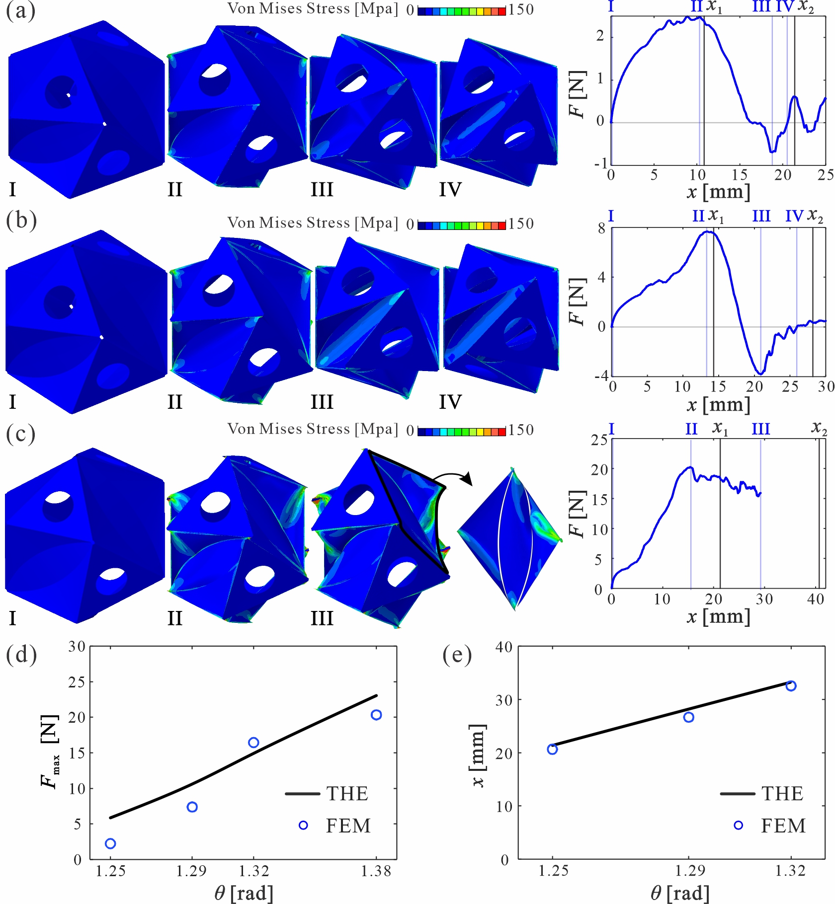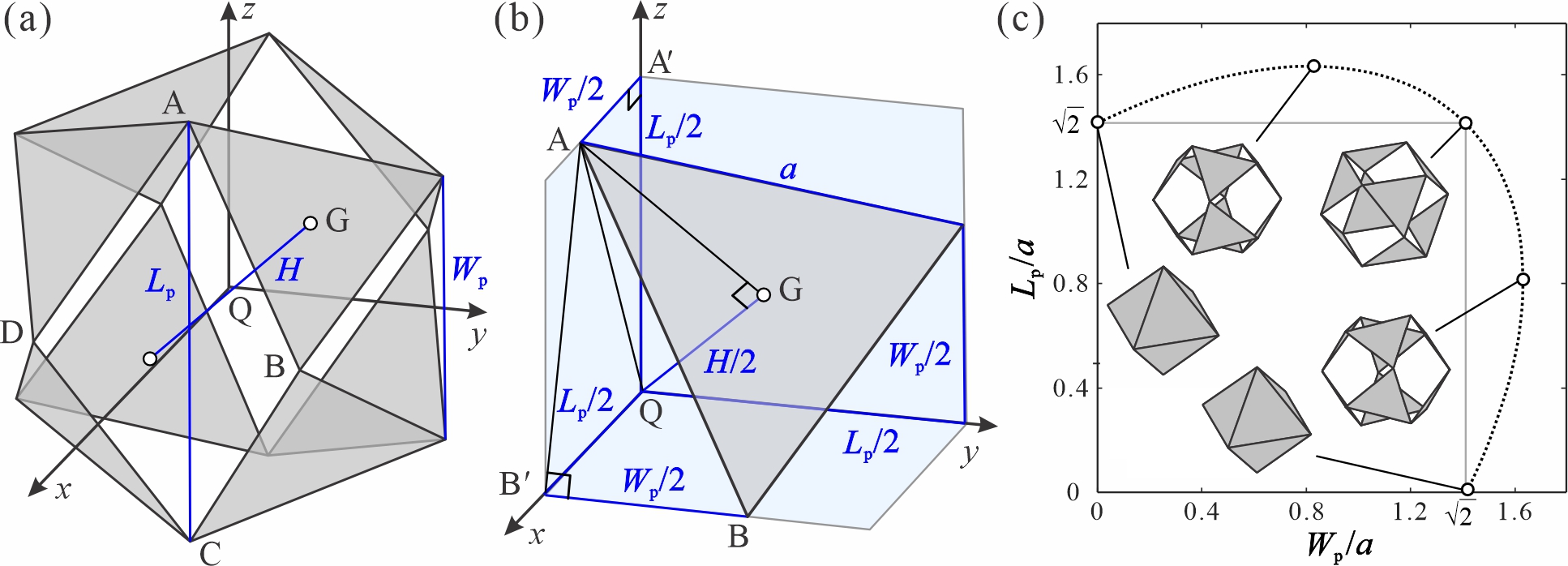 Movie: Geometric construction and bistable behavior of the curved-crease origami polyhedron The curved-crease origami polyhedron is constructed by assembling six curved-crease origami (CCO) units within an open polyhedral framework. Each CCO unit features a diamond-shaped boundary subdivided by two symmetrical circular curved creases into a central lens-shaped panel and two wing panels (Fig. 1). Under the boundary constraints imposed by the rigid polyhedral framework, the CCO units undergo isometric deformation along the creases, forming a single-parameter deformation family consisting of two conical surfaces and one cylindrical surface. A folding kinematics model based on differential geometry theory is established, clarifying the evolution of the longitudinal and transverse diagonal lengths of the unit with respect to the folding angle. The polyhedral framework comprises eight identical equilateral triangular panels, hinged at their vertices, with side lengths consistent with those of the CCO units (Fig. 2). By establishing the geometric correspondence, a single-degree-of-freedom folding kinematics model of the framework under orthogonal symmetry constraints is developed, revealing the complete folding path from a truncated octahedron to a regular octahedron, from which analytical expressions for the two diagonal lengths of the framework are derived. Fig. 1. Geometric parameters and folding kinematics of the CCO unit Fig. 2. Geometric parameters and folding kinematics of the polyhedral framework By correlating the kinematic curves of the CCO units and the polyhedral framework, a geometric incompatibility coefficient is defined as the normalized difference in longitudinal diagonal lengths between the two components at the same transverse diagonal length, quantifying the degree of kinematic mismatch between them (Fig. 3). Based on the intersection characteristics of the kinematic curves, the design parameter space is classified into four categories: a bistable type with two intersection points; a quasi-stable type with a single intersection point but two local minima in the geometric incompatibility coefficient; a monostable type with a single intersection point and a monotonically varying incompatibility coefficient; and an unassemblable type with no intersection points. To achieve the desired bistable behavior, within the parameter range of the bistable type, varying the sector angle and crease curvature of the CCO unit enables broad programmability of the maximum geometric incompatibility coefficient, the folding displacement corresponding to this maximum, and the location of the second stable state intersection point (Fig. 4), thereby establishing a theoretical foundation for the programmable bistable design of curved-crease origami polyhedrons. Fig. 3. Geometric compatibility analysis of the curved-crease origami polyhedron Fig. 4. Parameter distribution of the three compatibility metrics within the bistable design region The bistable behavior of the curved-crease origami polyhedron was further validated through a combination of experimental testing and numerical simulation (Fig. 5). The experimental and numerical results show that geometric incompatibility during folding induces a tensile constraint from the polyhedral framework on the CCO units along the longitudinal direction, causing the initial curved creases to gradually become ineffective and ultimately forming a virtual straight crease along the longitudinal direction of the central panel. This virtual crease disappears once the structure snaps through to the second stable state, representing the dominant deformation mode by which the structure accommodates geometric incompatibility. Furthermore, comparing the evolution of the geometric incompatibility coefficient with the compressive load–displacement curve reveals that the peak of the force–displacement curve precisely corresponds to the maximum of the geometric incompatibility coefficient, while the equilibrium position of the second stable state coincides with the zero point of the incompatibility coefficient. This correspondence confirms that geometric incompatibility is the governing mechanism driving the bistable snap-through behavior of the curved-crease origami polyhedron. Fig. 5. Bistable behavior of the curved-crease origami polyhedron Fig. 4. Parameter distribution of the three compatibility metrics within the bistable design region Furthermore, a systematic parametric analysis was conducted for the two key geometric parameters, the sector angle and the crease curvature (Figs. 6 and 7), further revealing a significant correlation between the initial peak force and the maximum geometric incompatibility coefficient. Given the notably different sensitivities of the initial peak force and stable state positions to variations in these two parameters, an approximately independent programming strategy for the bistable behavior of the curved-crease origami polyhedron is proposed: the sector angle is first selected to determine the initial peak force, after which the crease curvature is independently adjusted to program the position of the second stable state without significantly affecting the peak force. This strategy provides a systematic framework for the customized design of programmable bistable responses in curved-crease origami polyhedrons. Fig. 6. Influence of the sector angle of the CCO unit on bistable behavior Fig. 7. Influence of the crease curvature on bistable behavior In summary, this work integrates curved-crease origami units with a rigid polyhedral framework and proposes a deployable polyhedral design strategy based on geometric incompatibility. It achieves, for the first time, bistable snap-through transformation between fully enclosed configurations of a truncated octahedron and a regular octahedron, and establishes a programmable control mechanism for the initial peak force and the positions of stable states. This design strategy can be extended 
